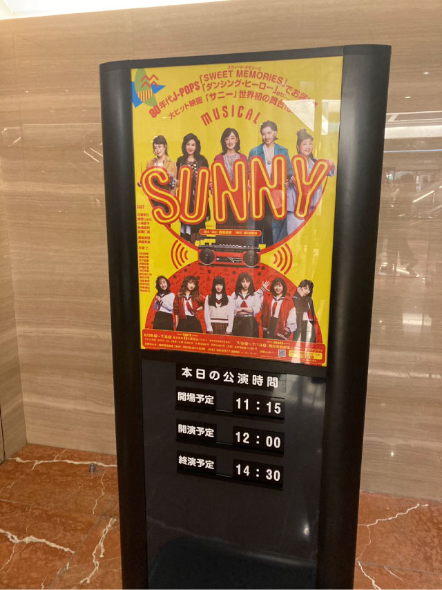 今年度は梅田芸術劇場シアター・ドラマシティーにおいて、ミュージカル「SUNNY」を観劇致しました。当日は梅雨空のなか、およそ90名の皆様にご参加いただき、大千秋楽日ということでほぼ満席の劇場で和やかなひとときをお過ごしいただきました。